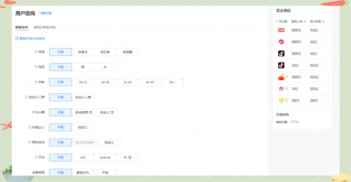 通投是指系统智能地进行定向投放,不依赖人为设定的任何定向条件。
